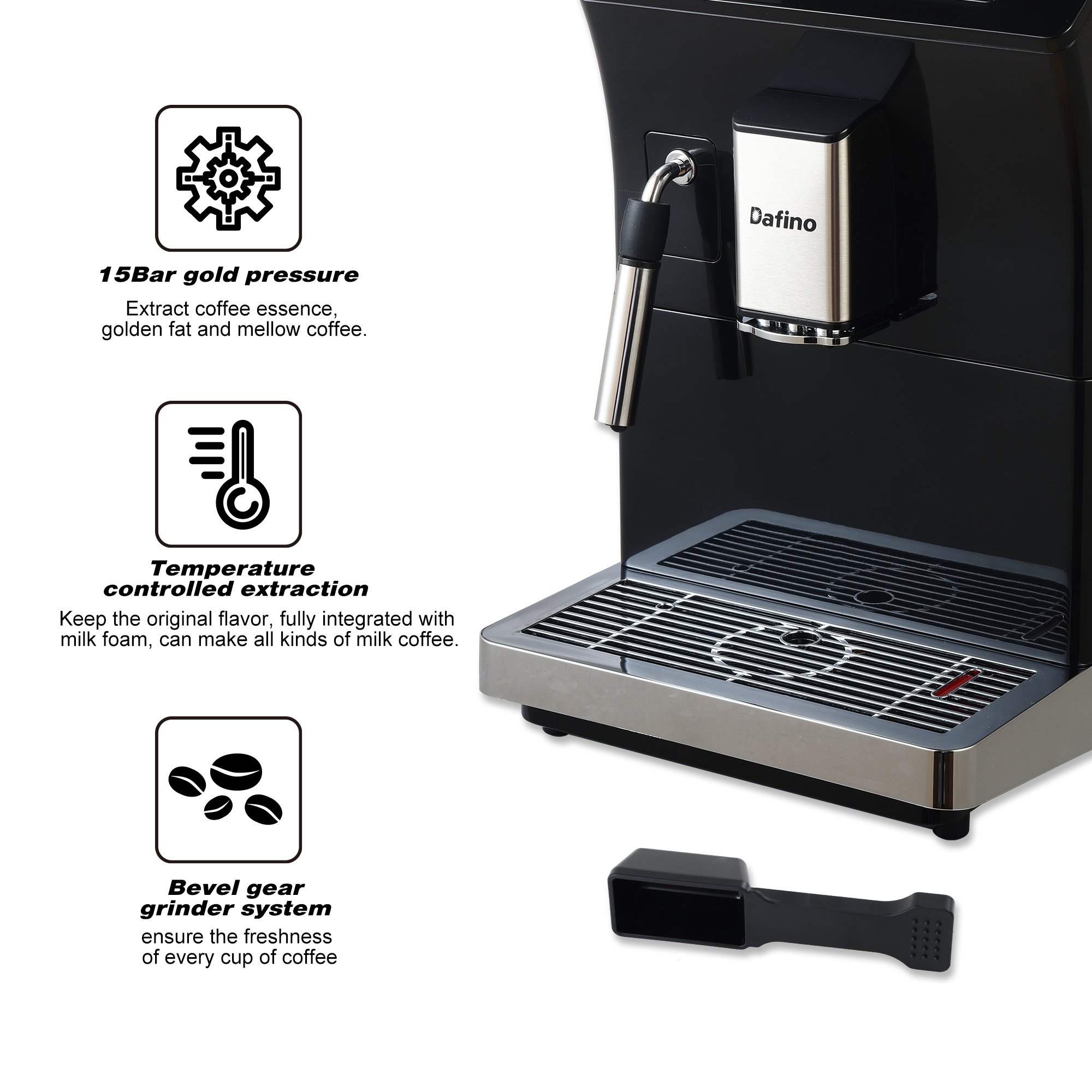 1.Exceptional 15Bar Gold Pressure: Enjoy the essence of coffee with our machine's 15Bar gold pressure, extracting golden fats and mellow coffee flavor, allowing you to taste the true richness in every sip.