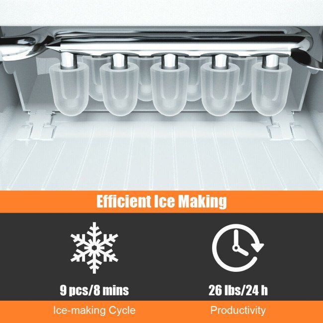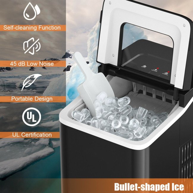 Produces 9 chewable bullet-shaped ice in 8 minutes for fast ice-makingMakes 26 lbs of ice each day, meeting your daily ice needsSelf cleaning function maker it convenient to clean and maintainSimple control panel for easy operationFood grade material, harmless to human bodyChecks the progress and amount of ice easily with transparent lidWill not disturb your entertainment with 45dB low noise operationConvenient to carry and store with portable and compact designSuitable for home, office, party and barTakes out the ice with ease thanks to included scoop and removable basketETL and UL certificated for safer use