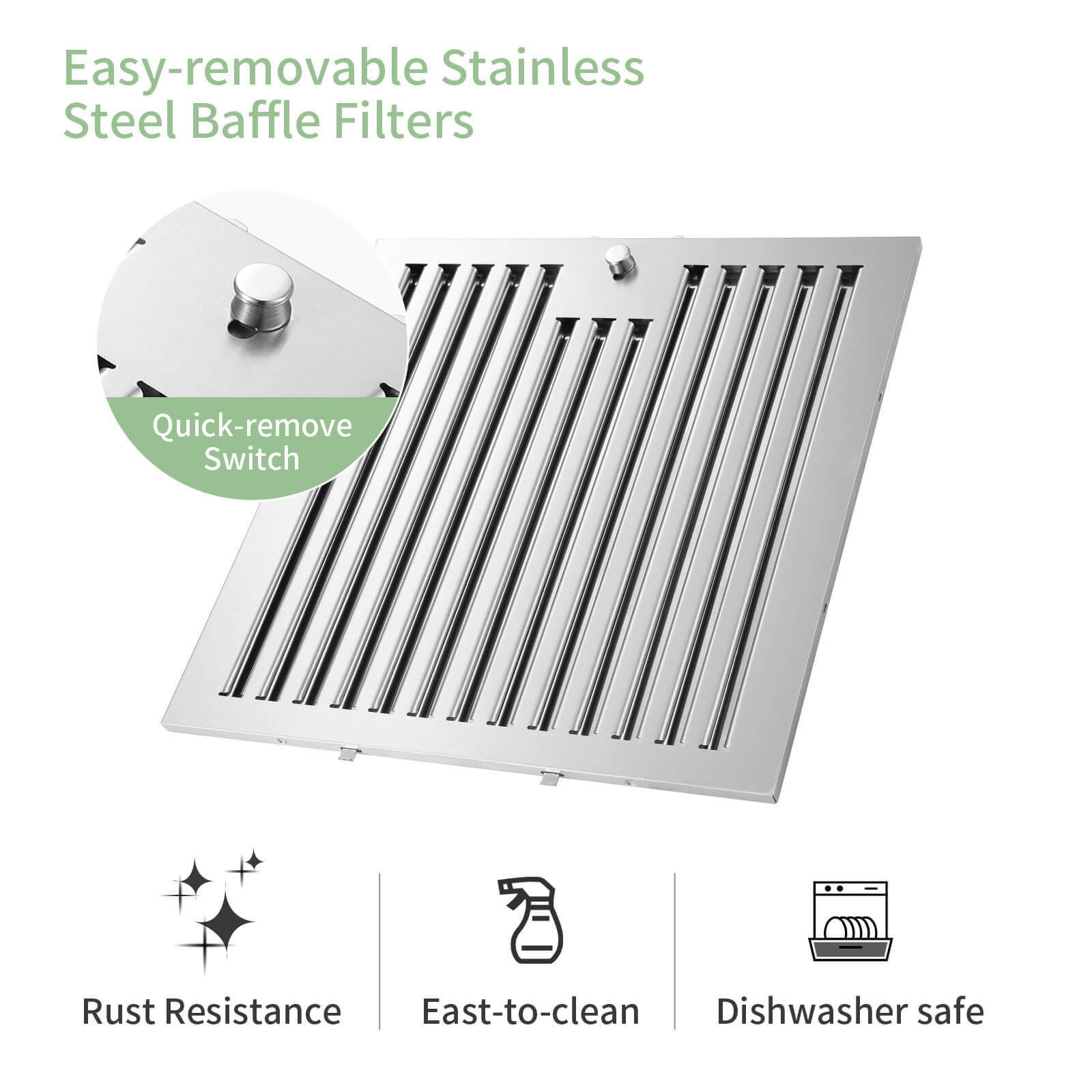 - Washable Stainless Steel Grease Filters to trap any unwanted grease to keep your kitchen fresh; Easy removable and easy to clean