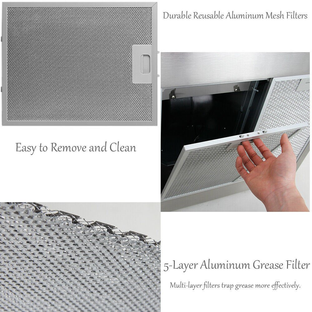 - Washable aluminium mesh filters to trap any unwanted grease to keep your kitchen fresh; Easy removable and easy to clean