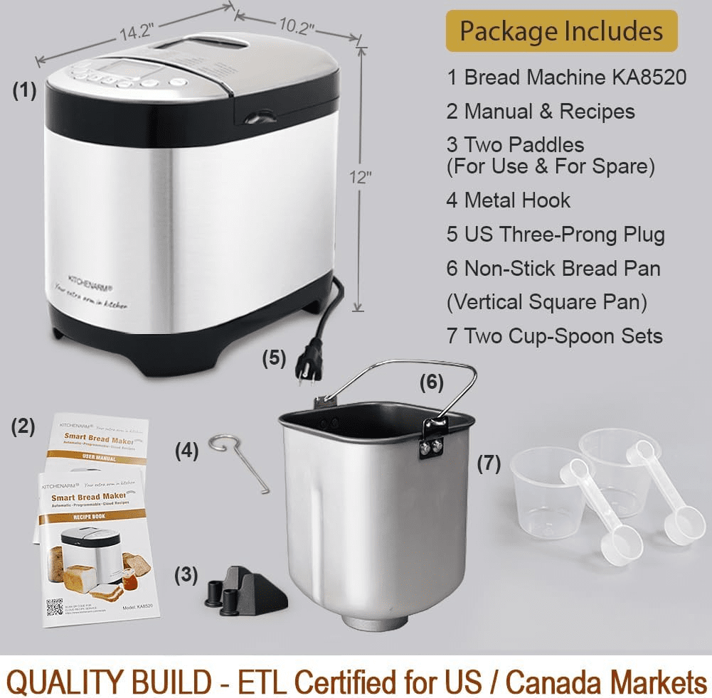 29-in-1 SMART BREAD MACHINE FOR NEWBIES & PROS - Your fresh healthy homemade bread is clicks away: just pick one of the many provided recipes or your own favorite recipe, and click a few buttons. - 29 Automatic Programs include 21 Bread Menus (Basic White, Sweet, French, Whole Wheat, Rye, Keto, Gluten Free, Sourdough..), 7 Non Bread Menus (Cake, Jam, Yogurt, Dough..), and the Fully Customizable Cycle-Level Programming HOME MADE Menu for almost any recipe. - Beginners Friendly & Pros Handy.UNIQUE 1-PRESS BREAD MAKING - All your settings are saved for the next use, including Menu / Loaf Size / Crust Color for a preset menu and your own settings for the HOME MADE menu. - It becomes 1-PRESS operation if you use the same recipe the next time: simply add ingredients and press the START button ONCE. - 29 Menus, 3 Loaf Sizes (1 / 1.5 / 2 LBS), 3 Crust Colors (Dark / Medium / Light), 15-Hour Delay Timer, 1-Hour Keep Warm, 15-Minute Power Interruption Recovery, ADD-NUTS Alarm, etc.MORE MENUS & RECIPES FOR HEALTHY BREADS - KitchenArm Menus & Recipes support both the high gluten bread flour and the less gluten all purpose flour that is inexpensive & healthier yet still makes wonderful breads; they are designed to handle fresh onions, oranges, zucchini, bananas, etc. in the most efficient way, so that the human preparation time is minimized. - Various Gluten Free breads & Whole Wheat bread w/o external gluten - 77 recipes included & hundreds more on KitchenArm Recipe Cloud.FULLY CUSTOMIZABLE CYCLE-LEVEL PROGRAMMING - You can explore your own variants based on a provided recipe for a preset menu, or create YOUR OWN MENU using the cycle-level programming HOME MADE menu (Menu #29) which allows you to specify each bread-making cycle time (KNEAD, REST, RISE, BAKE..) to fully adapt the machine to your own recipes. - It also enables you to utilize hundreds of recipes on KitchenArm Recipe Cloud. - This advanced feature is both Pros Handy and Beginners Friendly.QUALITY BUILD & DEVOTED SERVICES - ETL Certified Kitchen Appliance for US / Canada markets - US / Canada Standard Three-Prong Grounding Plug for electric safety and longer product lifespan - 2.5" Large Visual Digital Display - Food Grade Teflon Coated Non-Stick Bread Pan - Discounted Original replacement parts available on Amazon - 2-YEAR Product Warrantv & LIFETIME Customer Service including Cloud Recipes, Recipe Personalization, etc.